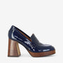 High-shine navy patent leather heels by NEO. The AG-24603 bring retro glam into the now. This loafer-inspired style features a sleek penny strap, stacked platform sole, and a sculptural flared block heel with wood-look finish with a square toe. Effortlessly statement-making—perfect for adding elevation (and attitude) to any look.